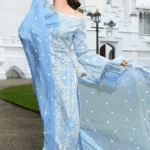 The Asim Jofa Luxury Lawn Suit Latest Collection 2023 is a must-have for any fashion-forward individual. The ice blue color of the suit is perfect for any occasion and the intricate embroidery work adds a touch of sophistication to the overall look of the outfit. Order now and elevate your wardrobe with this eye-catching design!