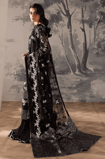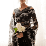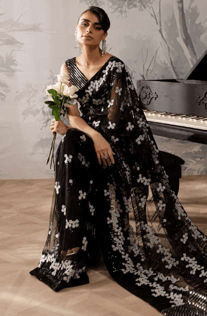 A black and white floral saree effortlessly combines sophistication with an artistic flair. The delicate floral embroidery on the black organza saree creates a timeless elegance, while the contrasting white sequin work adds a touch of glamour. This saree is a versatile option, perfect for formal gatherings, festive occasions, or even weddings, offering a stunning blend of traditional charm and contemporary style. isko roman urdu ma share karo ma read karna chata hu