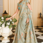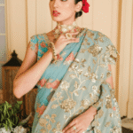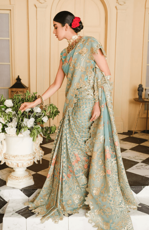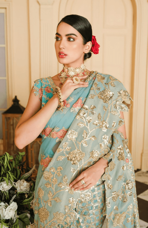 Embroidered Chiffon Blouse & Sleeves                                                                                                                                        Embroidered Organza Saree.                                                                                                                                                        Embroidered Organza Anchal                                                                                                                                                          Embroidered Organza Palu Patch Embroidered Organza
