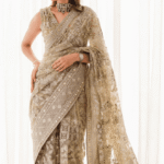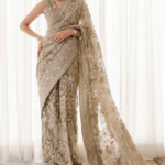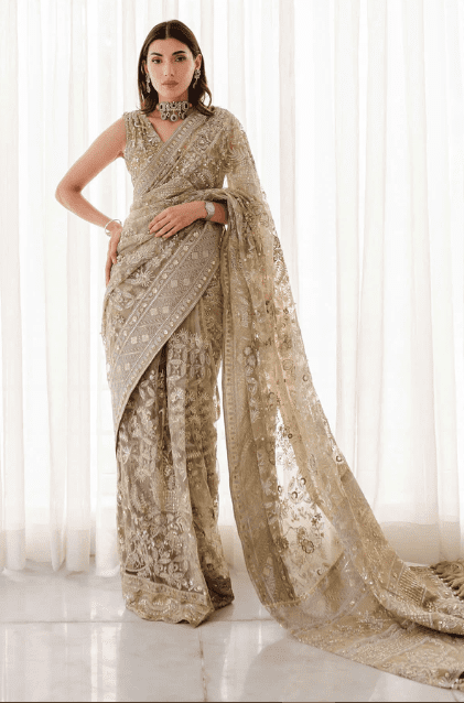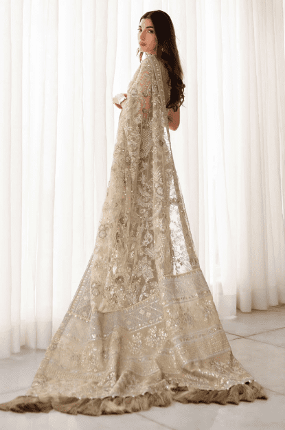 Introducing a stunning ensemble crafted from delicate net fabric, showcasing meticulous embroidery and hand embellishments. The front body features embroidered and hand-embellished net, while the back body is made from plain dyed net for a seamless look. The upper panel is beautifully embroidered with intricate details, complemented by an embroidered net lower panel. The sleeves are adorned with embroidered and hand-embellished net for a cohesive design. The silk front and back daman border, along with the two embroidered organza upper panel borders, add a touch of elegance and sophistication. The outfit is completed with embroidered raw silk trousers and a plain dyed resham cotton inner for added comfort.