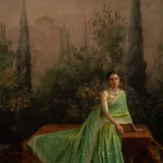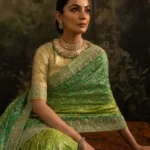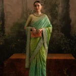 This green golden saree is crafted with embroidered Jamawar front and back bodice, finished with an organza neckline for elegance. The saree fall and pallu are beautifully printed and embroidered on rich Tussar silk, enhanced with an organza border. Jamawar sleeves with organza borders add charm, while a medium silk petticoat ensures comfort. Available in all sizes (XSā2XL), stitched to perfection for weddings and party wear.