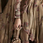 The Hussain Rehar Mahvash outfit is a masterpiece of elegance and luxury, crafted from premium organza and Korean silk. The tea pink base paired with golden embroidery creates a timeless festive look. Available in sizes XS to 5XL, with custom size stitching offered by Salai Karai USA for a perfect tailored fit. Ideal for weddings, festive gatherings, or formal parties.