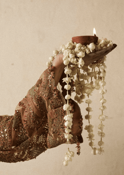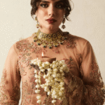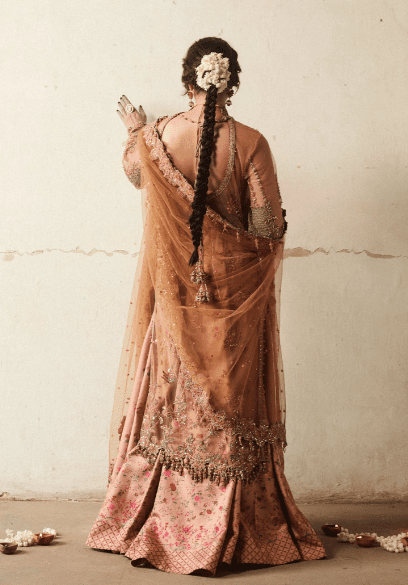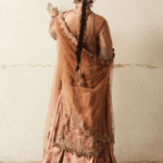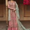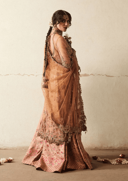 It is a beige net embroidered and embellished shirt, gives a delicate and ethereal look. Paired with floral printed Korean Raw-silk paneled sharara adding a volume and enhance the overall look. Net embroidered four side border and corner motifs dupatta, adds an intricate detail to the entire outfit.