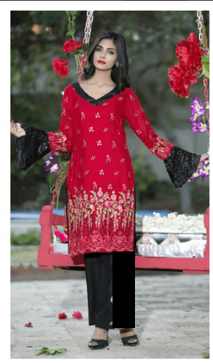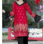 KHAADI NET EMBROIDERED RED KURTI TROUSER