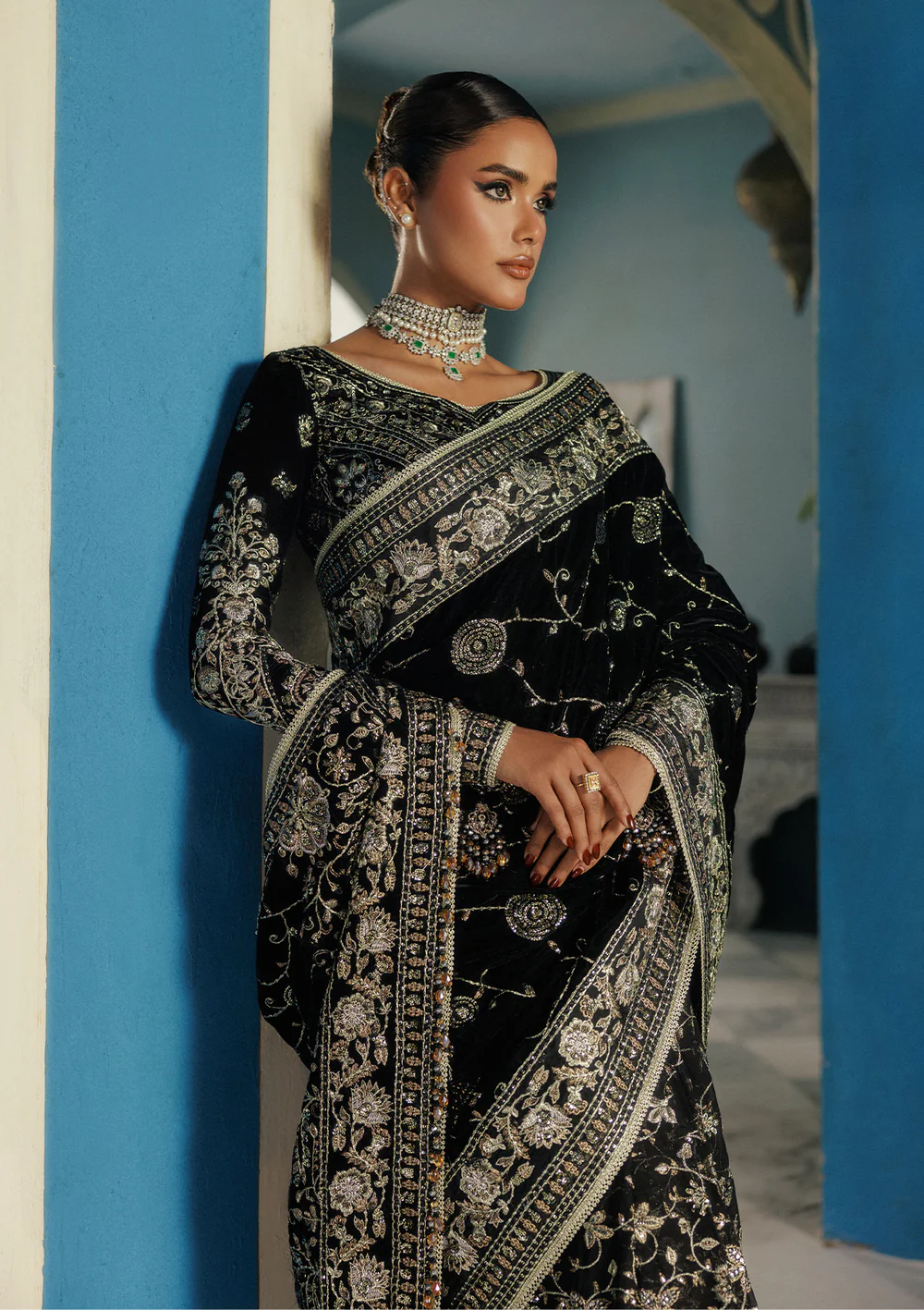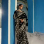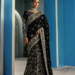 Experience timeless glamour with this Luxury Black Velvet Embroidered Saree, a perfect fusion of traditional artistry and modern sophistication. Crafted on plush velvet fabric with intricate silver embroidery, this saree showcases a stunning chiffon fall and heavily embellished pallu for a royal look. The matching embroidered blouse with organza neckline detailing completes the ensemble beautifully.