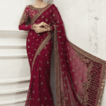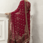 “Fall in love with the intricate craftsmanship of this Maria B Bridal Wear Saree. Each saree is meticulously stitched by skilled artisans, ensuring a one-of-a-kind design. The rich red color and elegant hand-embroidery make it the perfect choice for any traditional Indian wedding.