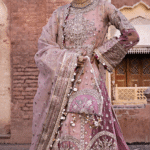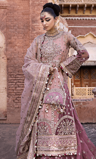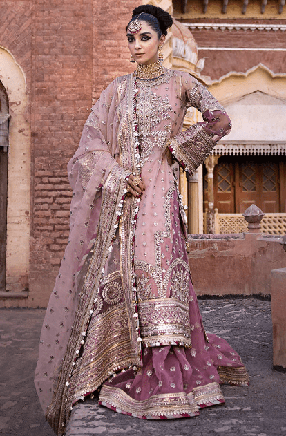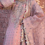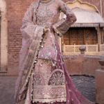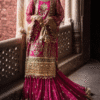 Introducing the enchanting ‘Arezoo’ ensemble in a captivating Rose Milk Pink. This ethereal creation features a beautifully embroidered organza shirt, highlighted by a dark pink hem patch and an exquisite satin silk hem border adorned with twin sequins. The sleeves are a stunning blend of two organza patches and a satin silk border, each embroidered and embellished to perfection. Complementing the shirt is an organza dupatta, showcasing two distinct pallus: one in darker pink organza and the other with intricate embroidery on satin silk, finished with an elegant four-sided border. The matching gharara, crafted in organza with a satin silk finishing border, adds a touch of grace and sophistication. Ideal for brides seeking timeless beauty and sheer elegance, the ‘Arezoo’ ensemble combines classic charm with contemporary flair, ensuring a breathtaking appearance on your special day