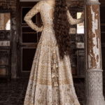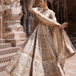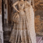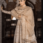 The “Moti” ensemble is a stunning celebration of bridal elegance, meticulously crafted in a soft palette of seashell, desert sand, and cream tones. This masterpiece features an embroidered shamar tilla net, showcasing 16 hand-embellished panels adorned with shimmering pearls, sparkling stones, and a cascade of gold and silver twin sequins. The ensemble is further enriched with two distinct embroidered and embellished patches on satin silk, adding layers of charm. A complete hem border on the shamar net enhances the ensemble’s ethereal appeal.