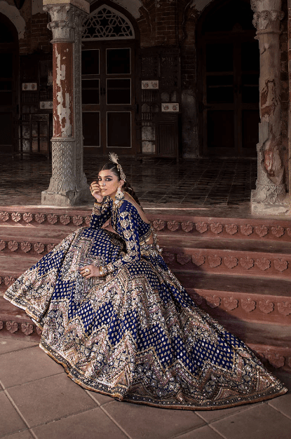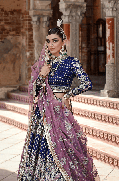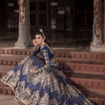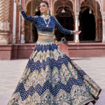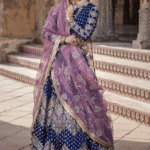 The “Shah Taj” ensemble is a stunning traditional lehenga choli in a captivating Sapphire Blue color. Here’s a breakdown of its key features: