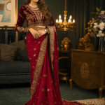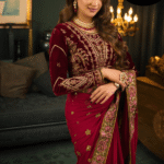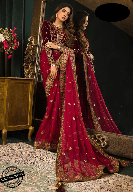 The party wear chiffon stitched embroidered red velvet saree is perfect for a wide range of formal occasions and events. Whether you are attending a wedding, a formal dinner, or a special event, this saree is sure to make you look and feel your best. The saree is also suitable for a range of other occasions, such as religious ceremonies and festivals.