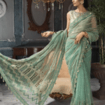 This saree is crafted from high-quality fabrics that drape beautifully and provide a comfortable fit. The aqua mint color is refreshing and perfect for any occasion, making this saree ideal for both day and evening events. The stitched embroidery adds a touch of elegance and sophistication to the saree, making it perfect for formal occasions.