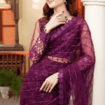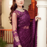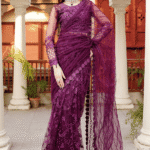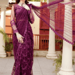 Enhance the beauty of your Purple Sari by pairing it with gold or silver jewelry. A sleek hairstyle or soft curls will complement the embroidered details beautifully. Whether it’s a wedding or a festive gathering, this saree ensures you make a statement with effortless grace.