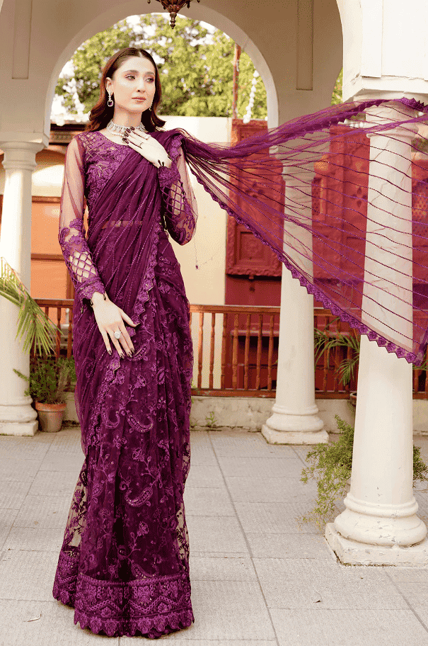 Purple is traditionally associated with royalty and sophistication. A Purple Sari elevates your wardrobe with its timeless charm. According to The Fabric Academy, net fabrics are versatile and perfect for creating flowy, ethereal outfits, making them ideal for special events.