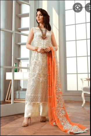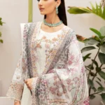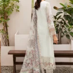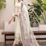 This Salai Karai White Chiffon Embroidered Dress is a timeless choice for formal gatherings, featuring sequin work, organza lace detailing, and a stunning digital printed tilla net dupatta. Perfectly paired with a raw silk trouser, it is available in standard and custom stitching sizes across the USA.